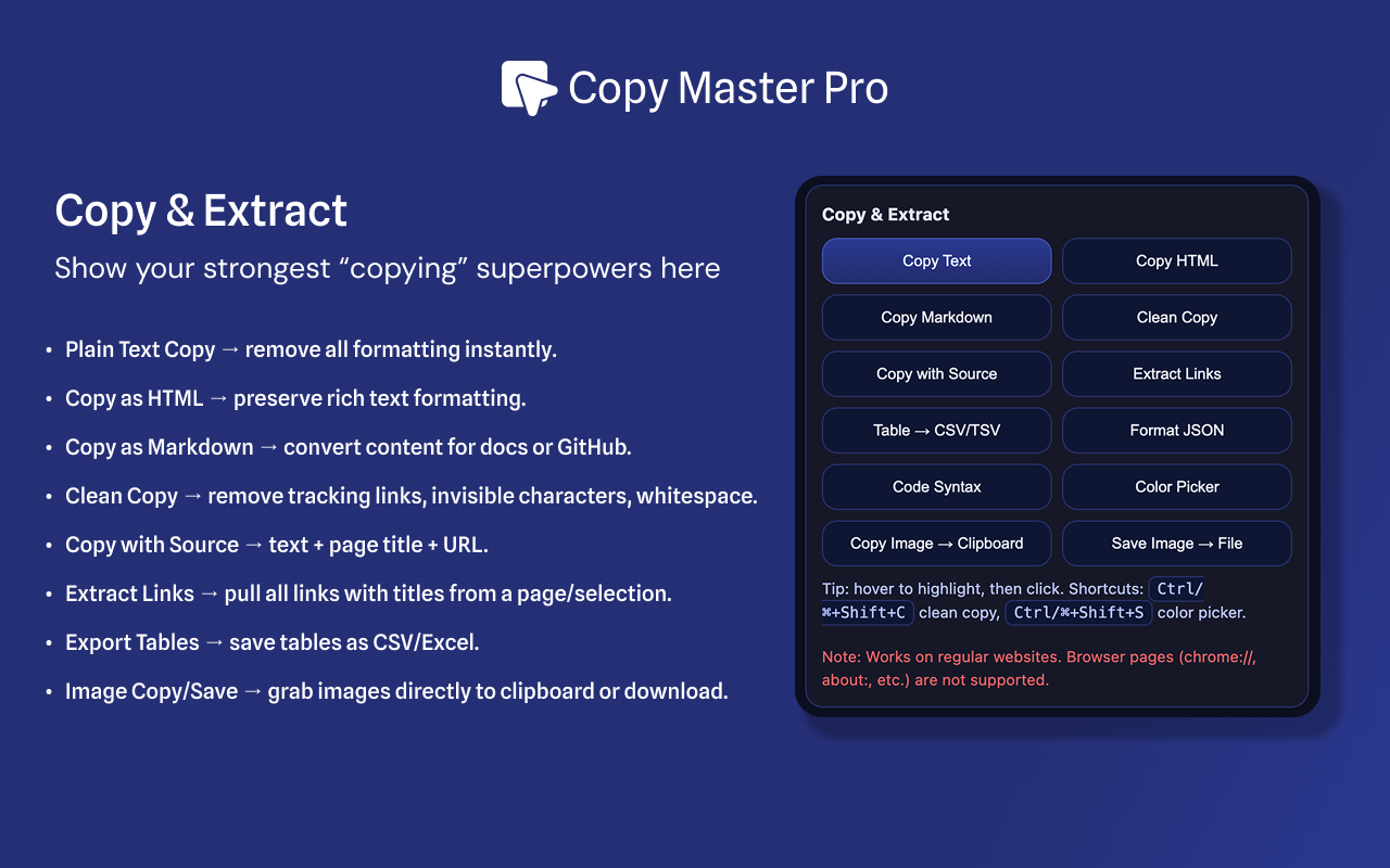 Copy Master Pro is a Chrome extension that gives you full control over how you copy, format, and manage content online. Instead of settling for the default “Ctrl+C → Ctrl+V,” you get precision tools that adapt to your workflow.